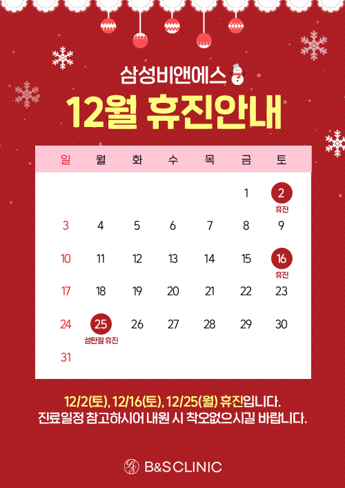 삼성비엔에스의원 12월 휴진 안내 페이지 정보 작성자최고관리자 접수일자2023-11-27 12:03:51 진료과목 연락처 관련링크 이전글 삼성비앤에스 2025년 11월 진료일정 목록 본문 삼성비엔에스의원 12월 휴진 안내 댓글 목록 등록된 댓글이 없습니다. 댓글등록 이전글 삼성비앤에스 2025년 11월 진료일정 목록